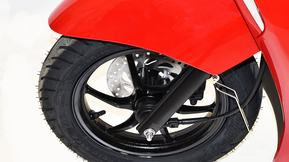 La parte delantera cuenta con un nuevo neumático 90/90-12 mientras que la parte trasera está equipada con un neumático 110/90-10 (el modelo actual es 90/100-10 tanto para la parte delantera como para la trasera). La llanta delantera de 12 pulgadas ayuda con la estabilidad en línea recta, mientras que la parte trasera de 110 mm de ancho le da a la nueva Fascino una presencia fuerte y un exterior de mayor calidad. Los rines son piezas ligeras de aluminio fundido de nuevo diseño. Su peso ligero se presta a una calidad de conducción rápida y ágil y le da una apariencia de más calidad.